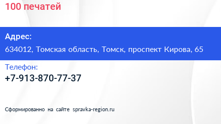100 печатей по адресу 634012, Томская область, Томск, проспект Кирова, 65 в дальнейшем Организация, размещена в следующих категориях: