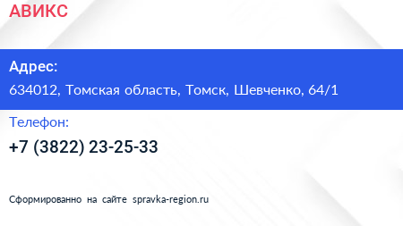 АВИКС по адресу 634012, Томская область, Томск, Шевченко, 64/1 в дальнейшем Организация, размещена в следующих категориях: