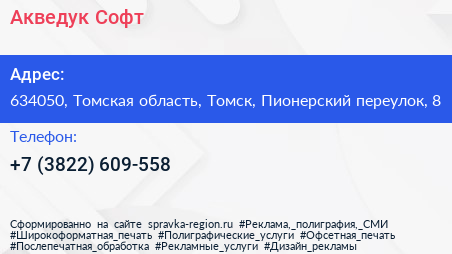 Акведук-Софт по адресу 634050, Томская область, Томск, Пионерский переулок, 8 в дальнейшем Организация, размещена в следующих категориях:
