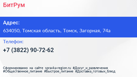 БитРум по адресу 634050, Томская область, Томск, Загорная, 74а в дальнейшем Организация, размещена в следующих категориях:
