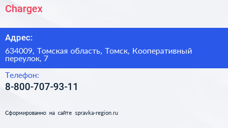 Chargex по адресу 634009, Томская область, Томск, Кооперативный переулок, 7 в дальнейшем Организация, размещена в следующих категориях: