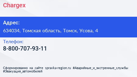 Chargex по адресу 634034, Томская область, Томск, Усова, 4 в дальнейшем Организация, размещена в следующих категориях: