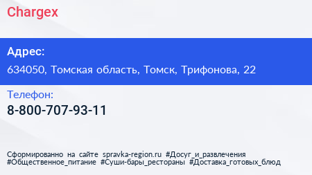 Chargex по адресу 634050, Томская область, Томск, Трифонова, 22 в дальнейшем Организация, размещена в следующих категориях: