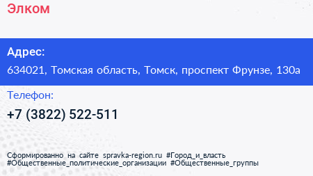 Элком+ по адресу 634021, Томская область, Томск, проспект Фрунзе, 130а в дальнейшем Организация, размещена в следующих категориях: