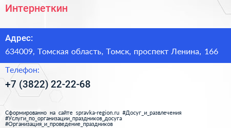 Интернеткин по адресу 634009, Томская область, Томск, проспект Ленина, 166 в дальнейшем Организация, размещена в следующих категориях: