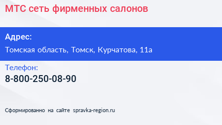 МТС, сеть фирменных салонов по адресу Томская область, Томск, Курчатова, 11а в дальнейшем Организация, размещена в следующих категориях: