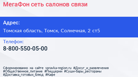 МегаФон, сеть салонов связи по адресу Томская область, Томск, Солнечная, 2 ст5 в дальнейшем Организация, размещена в следующих категориях: