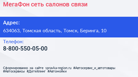МегаФон, сеть салонов связи по адресу 634063, Томская область, Томск, Беринга, 10 в дальнейшем Организация, размещена в следующих категориях: