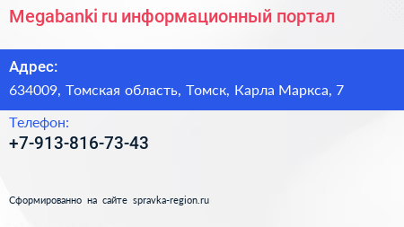 Megabanki.ru, информационный портал по адресу 634009, Томская область, Томск, Карла Маркса, 7 в дальнейшем Организация, размещена в следующих категориях:
