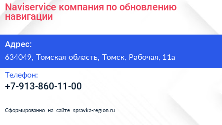 Naviservice, компания по обновлению навигации по адресу 634049, Томская область, Томск, Рабочая, 11а в дальнейшем Организация, размещена в следующих категориях: