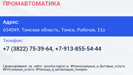 ПРОМАВТОМАТИКА по адресу 634049, Томская область, Томск, Рабочая, 11а в дальнейшем Организация, размещена в следующих категориях: