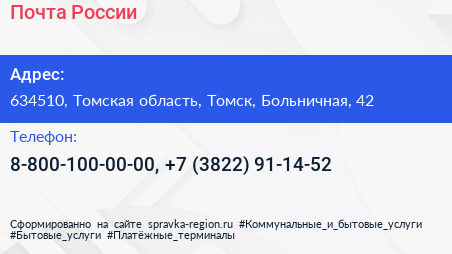Почта России по адресу 634510, Томская область, Томск, Больничная, 42 в дальнейшем Организация, размещена в следующих категориях: