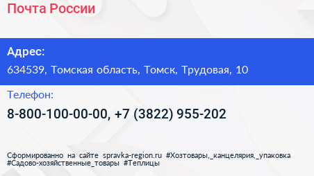 Почта России по адресу 634539, Томская область, Томск, Трудовая, 10 в дальнейшем Организация, размещена в следующих категориях: