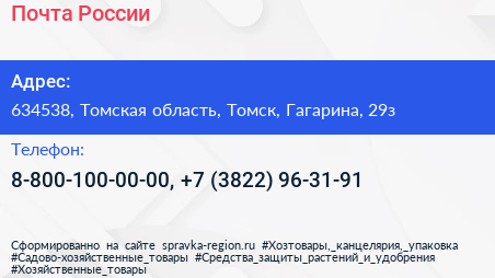 Почта России по адресу 634538, Томская область, Томск, Гагарина, 29з в дальнейшем Организация, размещена в следующих категориях: