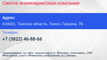 Синтек, инжиниринговая компания по адресу 634021, Томская область, Томск, Герцена, 78 в дальнейшем Организация, размещена в следующих категориях: