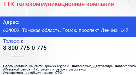 ТТК, телекоммуникационная компания по адресу 634009, Томская область, Томск, проспект Ленина, 147 в дальнейшем Организация, размещена в следующих категориях: