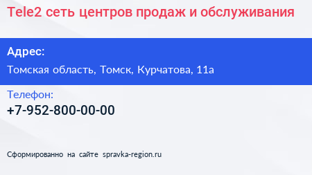 Tele2, сеть центров продаж и обслуживания по адресу Томская область, Томск, Курчатова, 11а в дальнейшем Организация, размещена в следующих категориях: