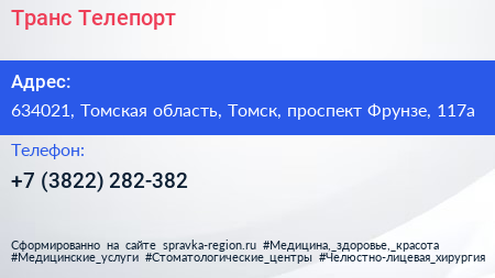 Транс Телепорт по адресу 634021, Томская область, Томск, проспект Фрунзе, 117а в дальнейшем Организация, размещена в следующих категориях: