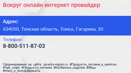 Вокруг онлайн, интернет-провайдер по адресу 634050, Томская область, Томск, Гагарина, 10 в дальнейшем Организация, размещена в следующих категориях: