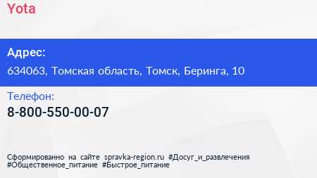 Yota по адресу 634063, Томская область, Томск, Беринга, 10 в дальнейшем Организация, размещена в следующих категориях: