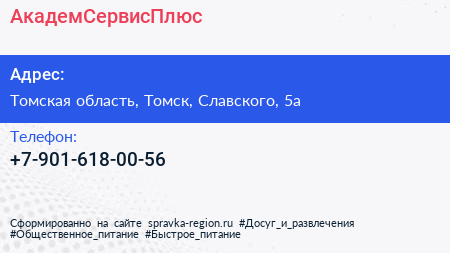 АкадемСервисПлюс по адресу Томская область, Томск, Славского, 5а в дальнейшем Организация, размещена в следующих категориях: