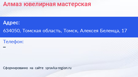 Алмаз, ювелирная мастерская по адресу 634050, Томская область, Томск, Алексея Беленца, 17 в дальнейшем Организация, размещена в следующих категориях: