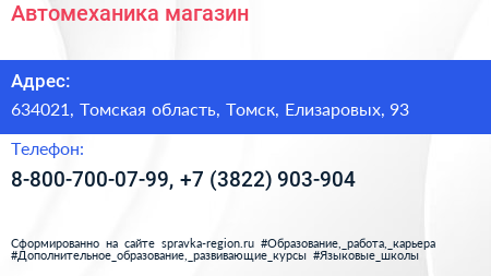 Автомеханика, магазин по адресу 634021, Томская область, Томск, Елизаровых, 93 в дальнейшем Организация, размещена в следующих категориях: