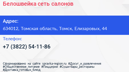Белошвейка, сеть салонов по адресу 634012, Томская область, Томск, Елизаровых, 44 в дальнейшем Организация, размещена в следующих категориях: