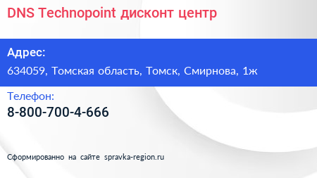 DNS Technopoint, дисконт-центр по адресу 634059, Томская область, Томск, Смирнова, 1ж в дальнейшем Организация, размещена в следующих категориях:
