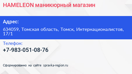 HAMELEON, маникюрный магазин по адресу 634059, Томская область, Томск, Интернационалистов, 17/1 в дальнейшем Организация, размещена в следующих категориях: