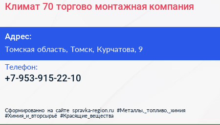 Климат 70, торгово-монтажная компания по адресу Томская область, Томск, Курчатова, 9 в дальнейшем Организация, размещена в следующих категориях: