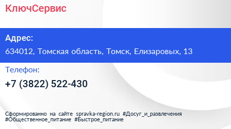 КлючСервис по адресу 634012, Томская область, Томск, Елизаровых, 13 в дальнейшем Организация, размещена в следующих категориях:
