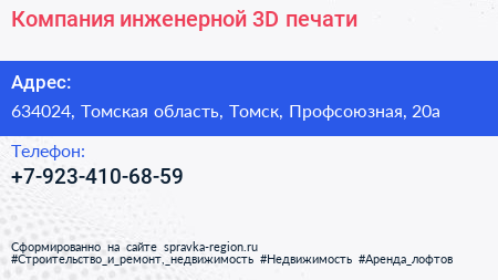 Компания инженерной 3D-печати по адресу 634024, Томская область, Томск, Профсоюзная, 20а в дальнейшем Организация, размещена в следующих категориях: