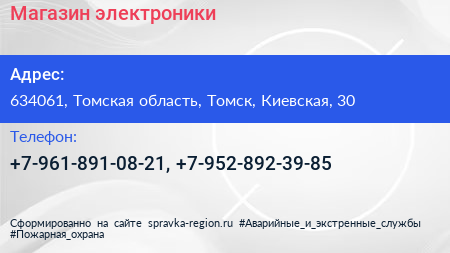 Магазин электроники по адресу 634061, Томская область, Томск, Киевская, 30 в дальнейшем Организация, размещена в следующих категориях: