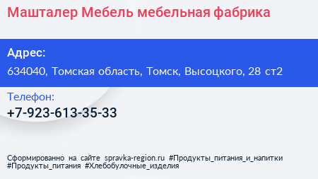 Машталер Мебель, мебельная фабрика по адресу 634040, Томская область, Томск, Высоцкого, 28 ст2 в дальнейшем Организация, размещена в следующих категориях: