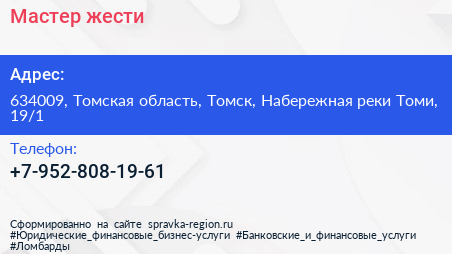 Мастер жести по адресу 634009, Томская область, Томск, Набережная реки Томи, 19/1 в дальнейшем Организация, размещена в следующих категориях: