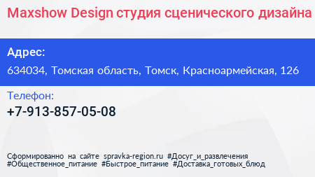 Maxshow Design, студия сценического дизайна по адресу 634034, Томская область, Томск, Красноармейская, 126 в дальнейшем Организация, размещена в следующих категориях: