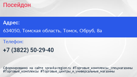 Посейдон по адресу 634050, Томская область, Томск, Обруб, 8а в дальнейшем Организация, размещена в следующих категориях: