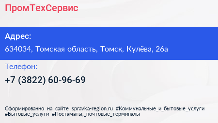 ПромТехСервис по адресу 634034, Томская область, Томск, Кулёва, 26а в дальнейшем Организация, размещена в следующих категориях: