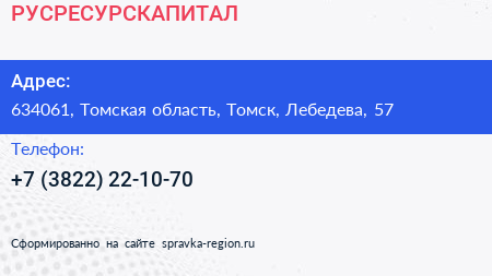 РУСРЕСУРСКАПИТАЛ по адресу 634061, Томская область, Томск, Лебедева, 57 в дальнейшем Организация, размещена в следующих категориях: