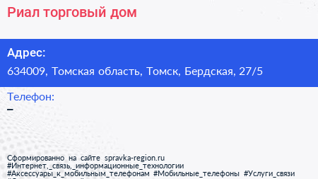 Риал, торговый дом по адресу 634009, Томская область, Томск, Бердская, 27/5 в дальнейшем Организация, размещена в следующих категориях: