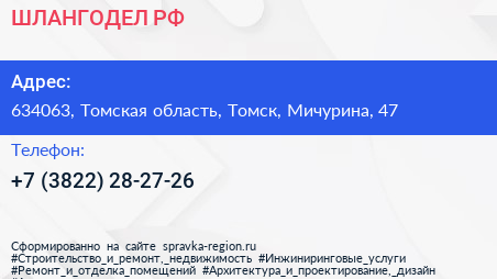 ШЛАНГОДЕЛ.РФ по адресу 634063, Томская область, Томск, Мичурина, 47 в дальнейшем Организация, размещена в следующих категориях: