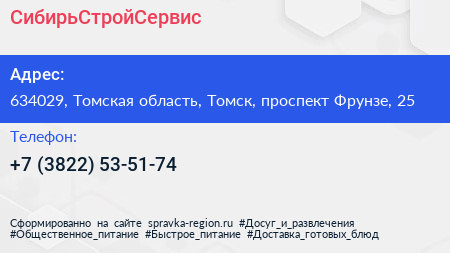 СибирьСтройСервис по адресу 634029, Томская область, Томск, проспект Фрунзе, 25 в дальнейшем Организация, размещена в следующих категориях: