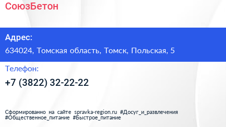 СоюзБетон по адресу 634024, Томская область, Томск, Польская, 5 в дальнейшем Организация, размещена в следующих категориях: