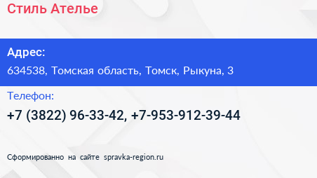 Стиль Ателье по адресу 634538, Томская область, Томск, Рыкуна, 3 в дальнейшем Организация, размещена в следующих категориях: