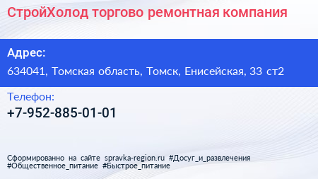 СтройХолод, торгово-ремонтная компания по адресу 634041, Томская область, Томск, Енисейская, 33 ст2 в дальнейшем Организация, размещена в следующих категориях: