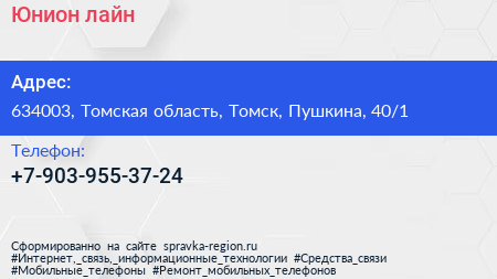 Юнион лайн по адресу 634003, Томская область, Томск, Пушкина, 40/1 в дальнейшем Организация, размещена в следующих категориях: