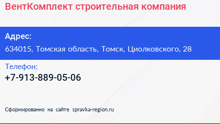 ВентКомплект, строительная компания по адресу 634015, Томская область, Томск, Циолковского, 28 в дальнейшем Организация, размещена в следующих категориях: