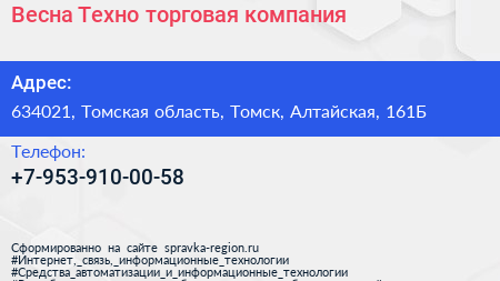 Весна-Техно, торговая компания по адресу 634021, Томская область, Томск, Алтайская, 161Б в дальнейшем Организация, размещена в следующих категориях: