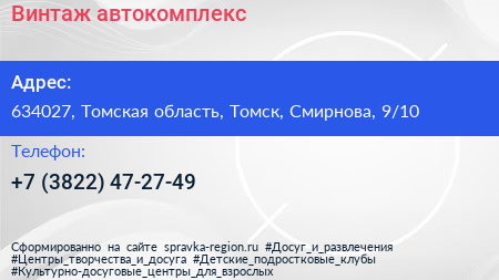 Винтаж, автокомплекс по адресу 634027, Томская область, Томск, Смирнова, 9/10 в дальнейшем Организация, размещена в следующих категориях: